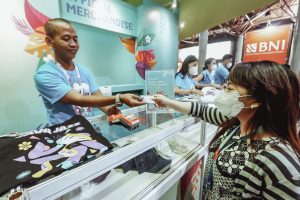 Pengunjung melakukan transaksi pembelian merchandise special BNI Java Jazz Festival 2022 menggunakan BNI Tapcash di Jakarta, Sabtu 28 Mei 2022.