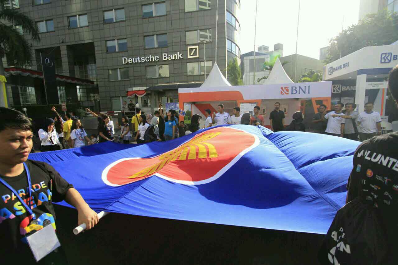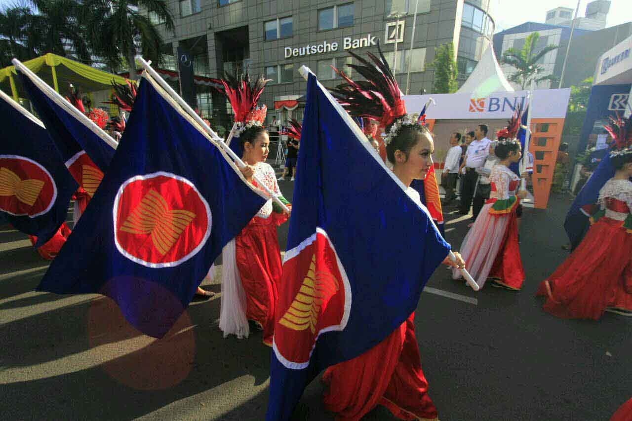 Direktur Internasional dan Treasury BNI Panji Irawan (bertopi Orange) bersama jajaran kementerian dan BUMN lain serta Sejumlah peserta Parade ASEAN 50 melakukan kirab di Kawasan Thamrin, Jakarta, Minggu 27 Agustus 2017.Partisipasi BNI juga mengenalkan Tapcash BNI edisi ASEAN .Parade yang diikuti peserta yang berasal dari negara anggota ASEAN dan sejumlah negara sahabat tersebut diselenggarakan dalam rangka HUT ke-50 ASEAN.(*)