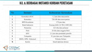 Bahkan, Menurut data Communication & Information System Security Research Center (CISSReC) mencatat, sistem keamanan siber yang dimiliki Bank Indonesia telah mengalami kebocoran dengan kapasitas yang lebih besar dari 74,82 GB. Tak tanggung-tanggung, data yang bocor ini diperkirakan telah mencapai 3.800 GB atau berkisar 3,8 TB berdasarkan data tang disampaikan dari CISSReC.