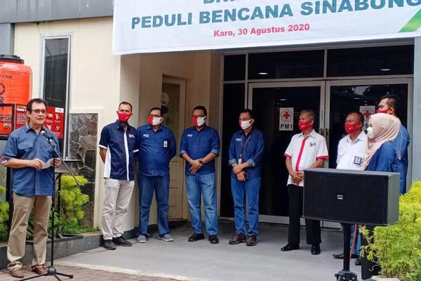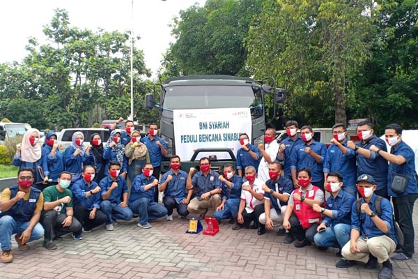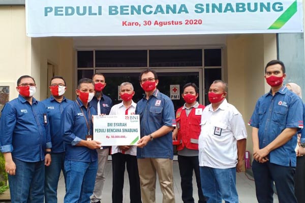 Pemimpin BNI Syariah Kantor Cabang Medan, Imam Samekto (tiga dari kiri) menyerahkan bantuan kepada Ketua PMI Sumatera Utara, Rahmat Syah (enam dari kiri) untuk kemudian disalurkan kepada korban bencana Gunung Sinabung, Kabupaten Karo, Sumatera Utara, Minggu 30 Agustus 2020. Dalam bantuan bertajuk BNI Syariah Peduli Bencana Sinabung, disalurkan bantuan paket sembako senilai total Rp50 juta. Bantuan paket sembako yang diberikan terdiri dari 325 paket berisi beras, gula, minyak goreng, sarden. Bantuan diangkut dengan menggunakan truk bekerjasama dengan TNI dan mobil PMI dari halaman Kantor PMI Sumatera Utara.