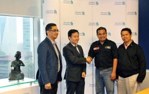 CEO Standard Chartered Bank (SCB) Indonesia, Shee Tse Koon (dua dari kiri) berbincang bersama (kiri-kanan) Country Head of Corporate Affairs SCB Indonesia Troy Pantouw, Vice President Yayasan Aksi Cepat Tanggap Ibnu Khazar, dan Staff Bidang Pemantauan Informasi dan Pusat Penanggulangan Krisis Kementerian Kesehatan, Zulkarnain, seusai penyerahan donasi dari SCB Indonesia untuk korban kabut asap di Jakarta, Rabu 11 November 2015. Donasi dalam bentuk 7.000 buah masker N95, makanan bayi dan balita, dan pemberian layanan kesehatan akan ditujukan kepada 300 korban bencana kabut asap di Palangkaraya, Kalimantan Tengah.(Budi Urtadi)