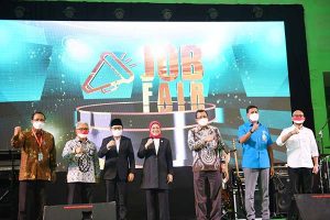 Menteri Ketenagakerjaan Ida Fauziyah (kanan) bersama Direktur Utama Bank BTN Haru Koesmahargyo, Direktur Human Capital, Compliance & Legal Bank BTN Eko Waluyo dan Direktur Utama BP Jamsostek Anggoro Eko Cahyo meninjau booth Bank BTN dalam acara Job Fair Pasker.id di Universitas Islam Negeri Sunan Ampel, Surabaya, Selasa, 23 Agustus 2022. Dalam acara tersebut Menaker secara símbolis memberikan Manfaat Layanan Tambahan (MLT) berupa KPR dan Pinjaman Renovasi Perumahan kepada peserta BP Jamsostek melalui Bank BTN.