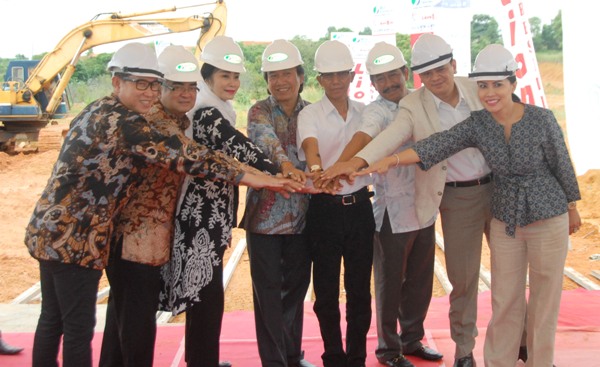 Direktur Consumer Banking BTN Handayani bersama Direktur BPJS Ketenagakerjaan Amran Nasution (kanan), Direktur Utama Lion Group Edward Sirait (kedua kanan) dan Direktur Utama Sarana Global Utama Yuyu Yuhanah (kiri) melakukan peletakan batu pertama pembangunan perumahan pekerja Lion Residence, di Batam, Kamis (12/10).