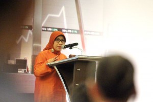 Kepala Eksekutif Pengawasan Pasar Modal Otoritas Jasa Keuangan (OJK) Nurhaida (tengah) berbincang dengan Direktur Pengembangan Bursa Efek Indonesia (BEI) Nicky Hogan (kiri), Direktur Utama PT Kliring Penjaminan Efek Indonesia (KPEI) Hasan Fawzi (kanan), Deputi Komisioner Pengawas Pasar Modal II OJK Noor Rahman dan Kepala Departemen Pengawasan Pasar Modal 2B Yunita Linda Sari di sela-sela Workshop Media 2015 di Padang,Senin 5 Oktober 2015. Kegiatan tersebut membahas mengenai Global Market Repurchase Agreement dan Pengembangan Infrastruktur Pasar Surat Utang serta Program Pengembangan Pasar Modal Syariah,dilanjutkan Forum Calon Investor dengan tema “Peluang Investasi di Pasar Modal Indonesia”.(*)