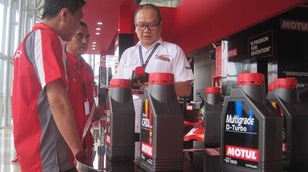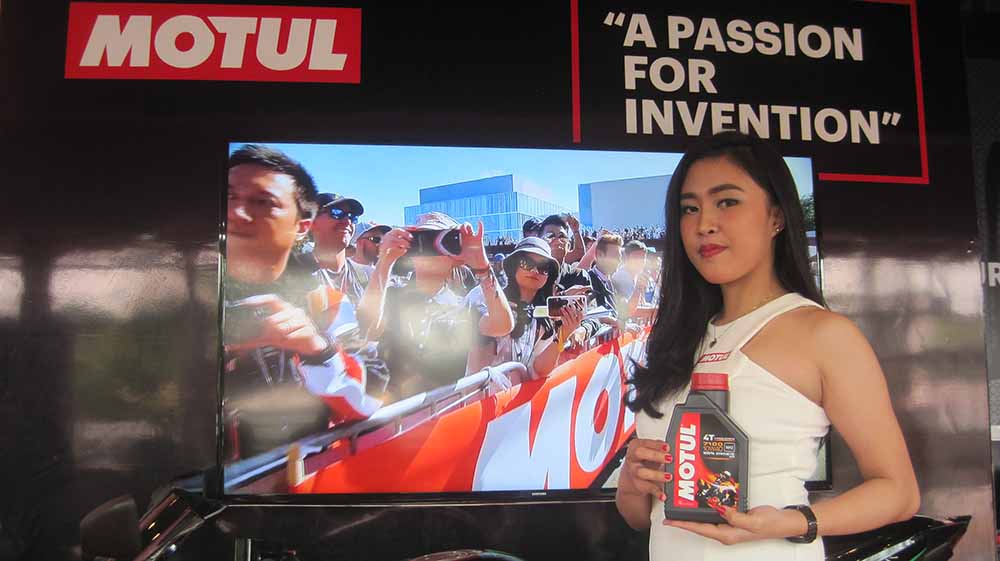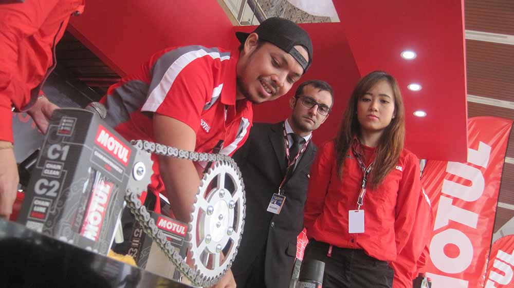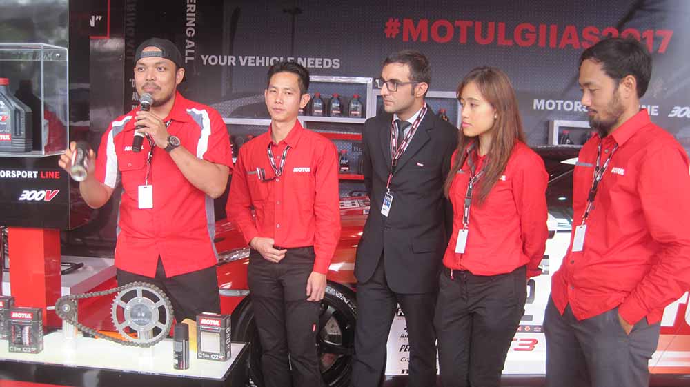 (Kiri-kanan) Marketing for Motul Indonesia, Muhammad Anwari, Deputy Marketing Manager Asia Pasifik Valerie Tan, GM Motul Indonesia Carlo Savoca, Business Development Manager Johan Wijaya dan Technocal Training Manager Ishadat Salam saat jumpa pers Motul di ajang GIIAS , tanggerang jumat 11 Agustus 2017.Motul merupakan produsen pelumas sintetik kelas dunia menggunakan teknologi Ester Core 300 V yang banyak digunakan kendaraan roda dua maupun empat pada ajang balapan internasional.