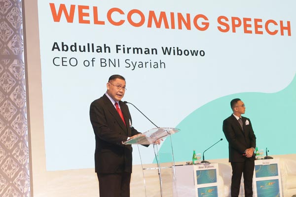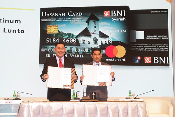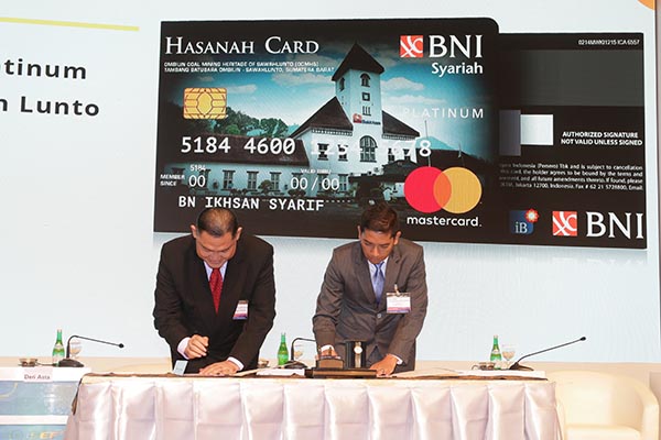 Direktur Utama BNI Syariah Abdullah Firman Wibowo (kiri) dan Walikota Sawahlunto Deri Asta (kanan) berjabat tangan usai acara penandatanganan nota kesepahaman (Memorandum of Understanding) antara BNI Syariah dengan Pemerintah Daerah Sawahlunto yang diadakan di Jakarta, Selasa, 12 November 2019. Dalam acara tersebut, BNI Syariah dan Pemerintah Daerah Sawahlunto juga sekaligus meluncurkan BNI iB Hasanah Card sebagai Official Transaction Syariah Card dengan desain khusus world heritage Ombilin Coal Mining of Sawahlunto, dalam acara perhelatan tahunan internasional, 14th The Islamic Financial Services Board (IFSB) Summit.