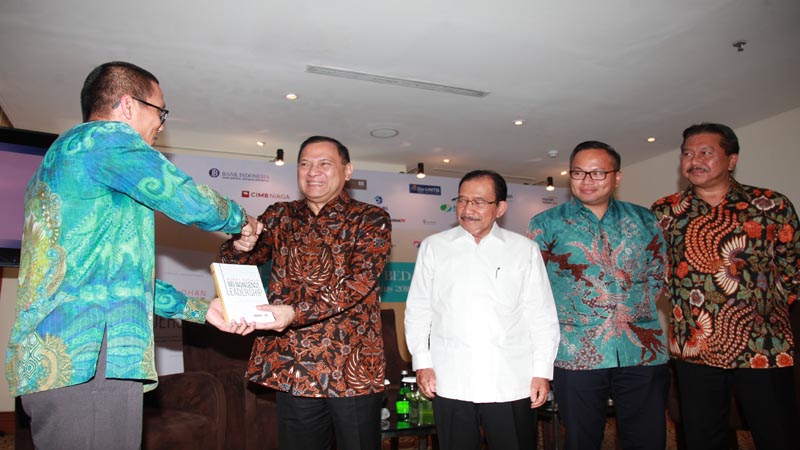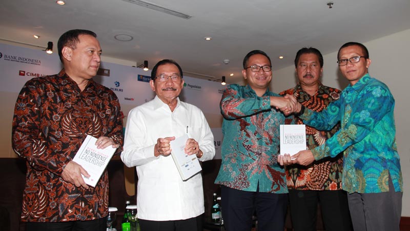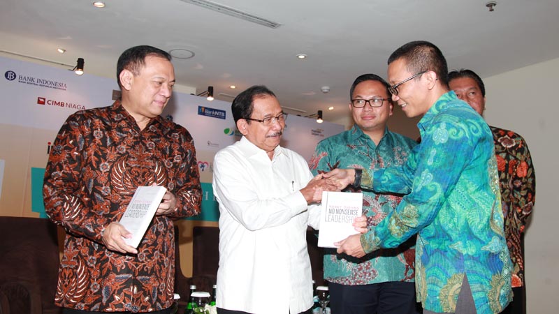 Wakil Pemimpin Redaksi Infobank, Karnoto Mohamad memberikan buku dengan judul Robby Djohan “No Nonsense Leadership” dan “The Guru” pada (dari kiri-kanan): Gubernur Bank Indonesia Agus D.W. Martowardojo, Komisaris Utama PT Pertamina Tanri Abeng, Dirut Bank Mandiri Kartika Wirjoatmodjo, serta Dirut Perum Peruri Prasetio, saat peluncuran buku tersebut di Jakarta, Rabu 31 Agustus 2016. Buku tersebut berisi pemikiran Robby Djohan, bankir senior sekaligus mantan CEO di sejumlah perusahaan nasional seperti Garuda Indonesia, Bank Niaga, Bank Mandiri, serta strategi dalam menghadapi situasi krisis perusahaan yang dipimpinnya. (*) Erman