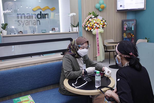 Direktur Distributions and Sales Mandiri Syariah Anton Sukarna (kiri) dan Region CEO Mandiri Syariah Jakarta Deden Durachman (kanan) mendampingi nasabah di Digital Branch Mandiri Syariah Kelapa Gading Jakarta, Rabu 4 November 2020. Mandiri Syariah melaunching Digital Branch Kelapa Gading Jakarta sebagai bentuk apresiasi dan peningkatan layanan bagi nasabah. Digital branch ke-empat Mandiri Syariah ini merupakan salah satu inovasi dan wujud komitmen Mandiri Syariah dalam menyediakan layanan yang modern dan berbasis teknologi.