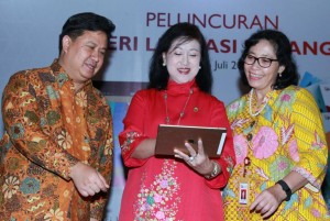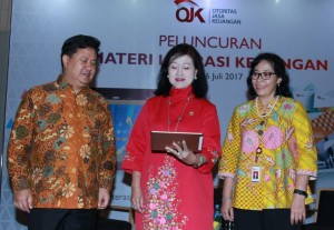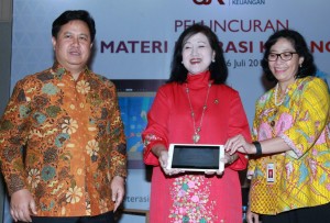 Kepala Departemen Literasi dan Inklusi Keuangan Agus Sugiarto, anggota Dewan Komisioner Bidang Edukasi dan Perlindungan Konsumen Kusumaningtuti S Soetiono, Deputi Komisioner Edukasi dan Perlindungan Konsumen Anggar B. Nuraini (dari kiri), tengah mencoba aplikasi buku literasi keuangan berbasis ebook, di Jakarta, Kamis 6 Juni 2017. OJK meluncurkan program Literasi Keuangan ke berbagai kalangan dengan memperbarui materi buku literasi keuangan tingkat SMA melalui versi elektronik dan menerbitkan buku literasi keuangan untuk segmen profesional dan pensiunan. Buku-buku dimaksud diharapkan dapat membantu masyarakat khususnya para profesional dan pensiunan dalam memahami, memilih, dan menggunakan produk serta layanan jasa keuangan yang sesuai dengan kebutuhan dan kemampuan masing-masing.