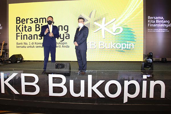 President Director PT Bank KB Bukopin Tbk. Rivan A. Purwantono (kiri) berbincang dengan Chief Strategic Officer Ji Kyu Jang saat peluncuran logo dan nama baru Bank KB Bukopin di Jakarta, Rabu, 10 Maret 2021. Bank KB Bukopin mengumumkan logo dan nama baru yang secara resmi telah disetujui oleh Bank Indonesia (BI) dan Otoritas Jasa Keuangan (OJK) sebagai salah satu langkah strategis yang dilakukan perseroan dalam rangka proses transformasi kepada nasabah. Perseroan yakin dengan langkah transformasi yang dijalani dapat mewujudkan visi menjadi TOP 10 bank di Indonesia dan menjadi pemain digital utama bagi bisnis retail dan segmen UMKM.