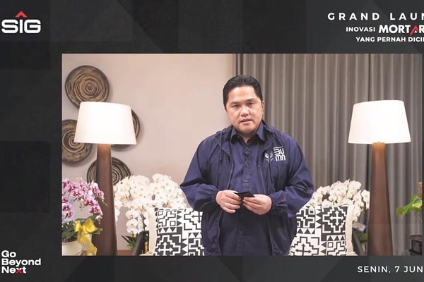 Direktur Utama SIG, Hendi Prio Santoso (pada layar) bersama Direktur Utama MKI, Mirza Whibowo Soenarto (kanan) secara virtual meresmikan meluncurkan produk “Mortar Indonesia”, yang juga di saksikan secara virtual Menteri Badan Usaha Milik Negara (BUMN), Erick Thohir, di Jakarta, Senin, 7 Juni 2021. PT Semen Indonesia Tbk (SIG) memperluas cakupan bisnisnya dengan meluncurkan varian produk baru. Melalui anak usaha, PT Mitra Kiara Indonesia (MKI), SIG secara resmi memperkenalkan produk “Mortar Indonesia” yang khusus membidik segmen premium pasar building material di tanah air. Langkah SIG meluncurkan produk Mortar Indonesia saat ini tak lepas dari visi perusahaan yang bertekad untuk menjadi penyedia solusi bahan bangunan terbesar di kawasan regional.