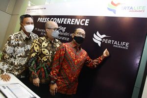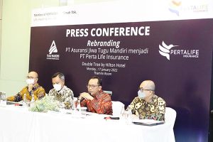 Direktur Utama Perta Life Insurance Hanindio W. Hadi (tengah) didampingi Direktur Perta Life Insurance Yuzran Bustamar (kiri) dan Haris Anwar (kanan) saat memberi keterangan pers terkait rebranding Perta Life Insurance di Jakarta, Senin, 17 Januari 2022. PT Perta Life Insurance (Perta Life Insurance) resmi sebagai brand baru menggantikan PT Asuransi Jiwa Tugu Mandiri. Rebranding identitas perusahaan ini menjadi simbol optimisme perusahaan dalam menghadapi tantangan ke depan. Selain itu Rebranding ini sebagai salah satu upaya meningkatkan performa yang lebih baik termasuk kepercayaan bagi para stakeholders dan nasabah melalui peningkatan kualitas layanan dan inovasi produk.