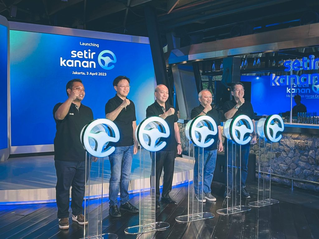 Project Executive of Setir Kanan Carolus Setjo Jatmika, Presiden Komisaris Astra Sedaya Finance Rudy Chen, Direktur Astra Suparno Djasmin, CEO Astra Credit Companies (ACC) Siswadi, dan Chief Marketing & Sales Officer ACC Tan Chian Hok (kiri ke kanan) saat melakukan Peluncuran Setir Kanan di Jakarta, Senin, 3 April 2023.