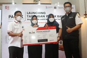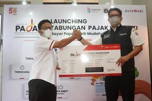 Direktur Ritel dan Syariah, Babay Parid Wazdi (kiri) secara simbolis memberikan Sertifikat Kepemilikan Tabungan Pajak kepada Wakil Kepala Badan Pendapatan Daerah Provinsi DKI Jakarta, Elvarinsa pada acara Launching Tabungan Pajak Bank DKI di Jakarta, Rabu, 30 Maret 2022. Melalui Tabungan Pajak, Wajib Pajak dapat menabung secara disiplin dan terjadwal untuk pembayaran pajak. Wajib Pajak yang membuka rekening Tabungan Pajak juga dapat lebih fleksibel menentukan tanggal autodebet, serta dapat melakukan pembayaran pajak dengan mengangsur secara bulanan. Wajib Pajak juga dapat menggunakan fasilitas autodebet pembayaran Pajak Bumi & Bangunan.
