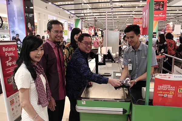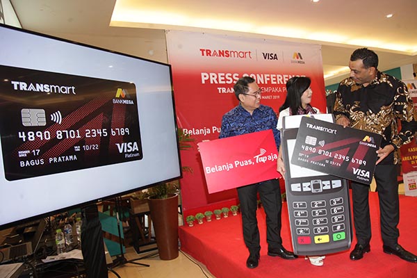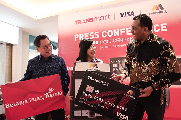 Direktur Consumer Banking PT Bank Mega Tbk Diza Larentie, Vice President Corporate Communication PT Trans Retail Indonesia Satria Hamid dan Presiden Direktur PT Visa Worldwide Indonesia Riko Abdurrahman (kiri ke kanan), bertransaksi dengan melakukan TAP kartu Transmart Mega Card di kasir di Jakarta, Kamis 14 Maret 2019. Transmart Mega Card, yang merupakan rebranding dari Carrefour Mega Card, kini dilengkapi teknologi nirsentuh (contactless) sehingga konsumen kini hanya perlu TAP untuk membayar, dengan kartu tetap berada di genggaman, demi kenyamanan dan keamanan lebih dalam berbelanja.