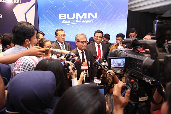 Direktur Utama PT Bank Rakyat Indonesia Tbk (BRI), Sunarso (tengah) bersama jajaran direksi lainnya berfoto bersama sebelum pemaparan kinerja keuangan BRI triwulan IV tahun 2019, di Jakarta, Kamis, 23 Januari 2020. PT Bank Rakyat Indonesia Tbk berhasil membukukan laba di 2019 sebesar Rp34,41 triliun. Keberhasilan perusahaan dalam membukukan laba ditopang oleh penyaluran kredit yang tercatat mencapai Rp908,88 triliun atau tumbuh 8,44%. Keberhasilan tersebut tidak lepas dari strategi perusahaan dalam menjaga kepercayaan nasabah terhadap BRI.