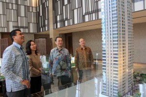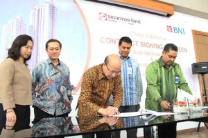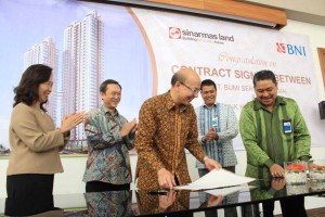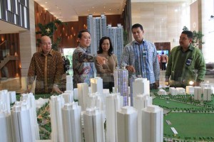Direktur Konsumer Banking BNI Anggoro Eko Cahyo (kedua kanan), Investor Relation and Corporate Secretary PT BSD Tbk, Residential CFO Sinarmas Land Handoko Wibowo (kedua kiri), dan Deputy Group CEO Sinarmas Land Monik William (tengah) melihat maket rencana pembangunan apartemen The Elements usai menyaksikan penandatanganan di Jakarta, Jumat 4 Maret 2016.Sinarmas Land Group dan PT Bank Negara Indonesia (Persero) Tbk (BNI) bekerjasama bersepakat dalam pembiayaan kepemilikan apartemen melalui fasilitas BNI Griya untuk apartemen mewah The Elements yang dibangun di kawasan strategis Rasuna Epicentrum, Kuningan, Jakarta.