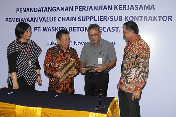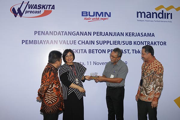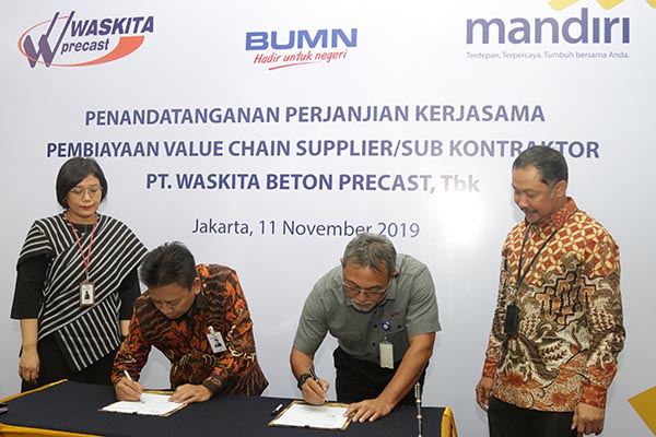 VP Corporate Banking Bank Mandiri Eny Kurniasih M, SVP SME Banking Bank Mandiri Choirul Anwar, Direktur PT Waskita Beton Precast Antonius Yulianto Tyas Nugroho, SVP SME & Micro Risk Bank Mandiri Muhammad Iqbal (kiri ke kanan) saat penandatangan perjanjian kerjasama di Jakarta, Senin 11 November 2019. Bank Mandiri memberikan pembiayaan khusus berbasis invoice tagihan kepada supplier yang telah mendapatkan verifikasi dan akseptasi PT Waskita Beton Precast dengan total plafond Rp300 miliar. Kerjasama ini diharapkan dapat membantu menperkuat likuiditas supplier dan meningkatkatkan kualitas pengadaan barang dan jasa supllier Waskita Beton Precast.