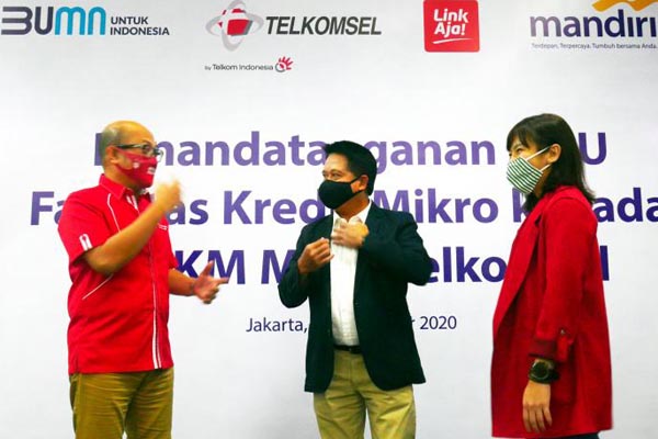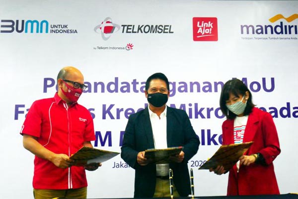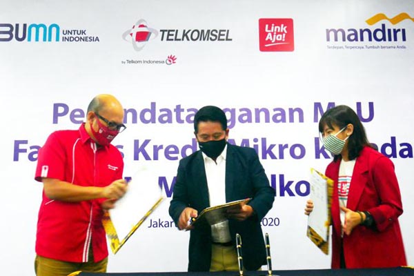 Wakil Direktur Utama Bank Mandiri Hery Gunardi (tengah), Direktur Utama Telkomsel Setyanto Hantoro (kiri) dan Direktur Utama Fintek Karya Nusantara (LinkAja) Haryati Lawidjaja tengah menunjukkan MoU Kerjasama Pembiayaan di Jakarta, Selasa 8 September 2020. Bank Mandiri menyiapkan fasilitas kredit mikro produktif yang akan disalurkan secara non tunai melalui LinkAja kepada lebih dari 500.000 mitra Telkomsel yang telah mengajukan permohonan pada Aplikasi Digipos. Kepastian pinjaman kemudian dapat diperoleh dalam waktu kurang dari 24 jam dan keseluruhan proses dilakukan secara digital tanpa tatap muka.
