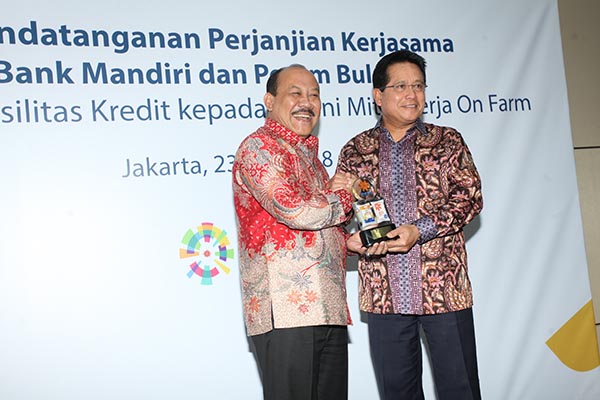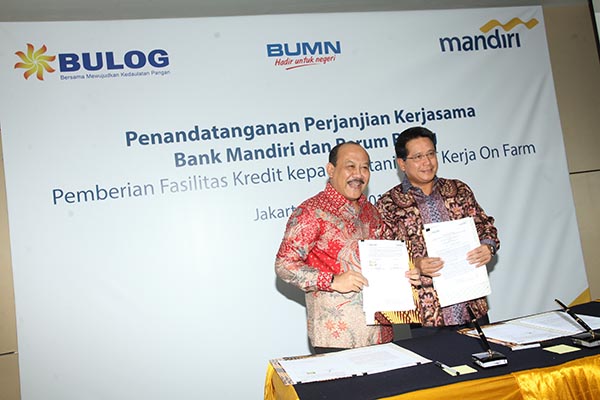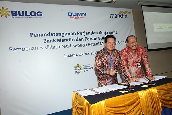 Direktur Bisnis Kecil dan Jaringan Bank Mandiri Hery Gunardi (kiri) dan Direktur Pengembangan Bisnis dan Industri Perum Bulog Imam Subowo sedang bertukar naskah perjanjian kerjasama di Jakarta, Rabu 23 Mei 2018. Dalam kerjasama ini, Bank Mandiri menyiapkan pembiayaan berskema KUR dengan bunga 7% per tahun sebagai modal kerja bagi petani mitra kerja on farm Bulog. Pada tahap awal, program ini akan menyasar ke petani padi mitra Bulog di Kecamatan Ligung, Kabupaten Majalengka, dan selanjutnya akan meluas ke daerah lainnya di Indonesia.(*)