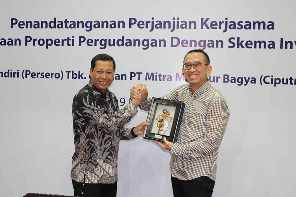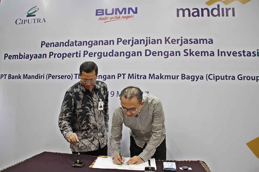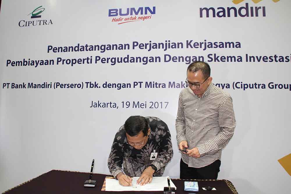 Direktur Retail Banking Bank Mandiri Tardi dan Direktur Utama Mitra Makmur Bagya Harun Hajadi tengah menandatangani perjanjian kerjasama pembiayaan di Jakarta, Jumat 19 Mei 2017. Bank Mandiri menyiapkan pembiayaan untuk pembelian properti pergudangan milik PT Mitra Makmur Bagya (Ciputra Group) dengan skema kredit investasi. Adapun limit pembiayaan yang disiapkan mencapai Rp10 miliar/debitur, dengan tenor maksimal 10 tahun.(Budi Urtadi)