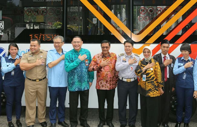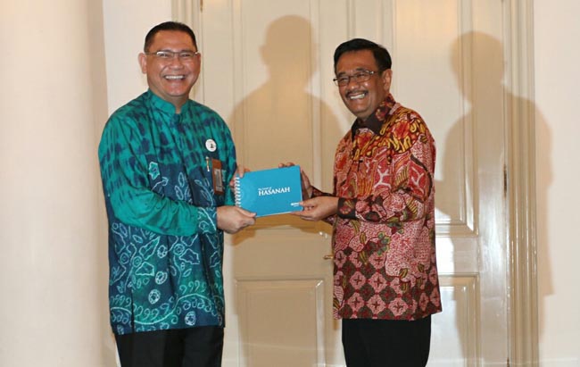 Plt Direktur Utama BNI Syariah Abdullah Firman Wibowo (kiri) bersama Gubernur DKI Jakarta Djarot Saiful Hidayat (kanan) menyaksikan Direktur Operasional BNI Syariah Juniadi Hisom (kedua kiri) dan Direktur Pelayanan & Pengembangan Bisnis Transjakarta Welfizon Yuza menandatanagi kerjasama di Jakarta, Selasa 18 Juli 2017. PT Bank Negara Indonesia Syariah (BNI Syariah) mendukung upaya PT Transportasi Jakarta (Transjakarta) menyediakan sarana transportasi layak. Hal ini diwujudkan dengan memberikan fasilitas pembiayaan syariah senilai Rp168 miliar.(Erman Subekti)
