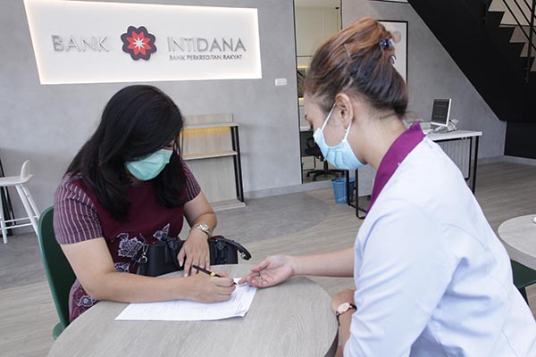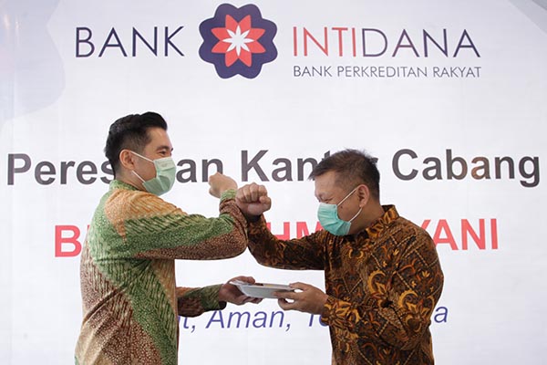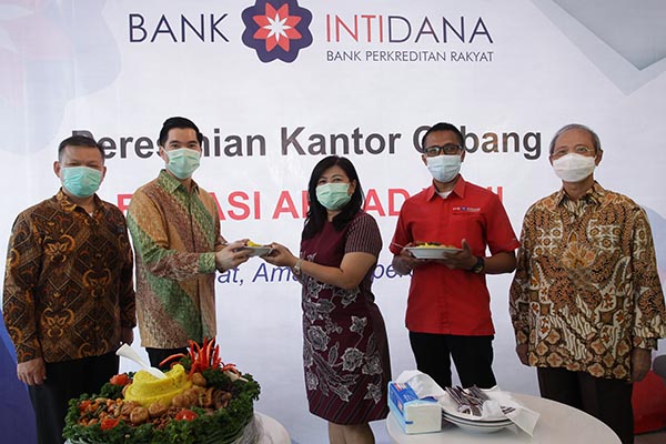 Komisaris Utama BPR Intidana Sukses Makmur Handy Widjaja (dua dari kiri), tengah memberikan potongan tumpeng kepada Kepala Cabang BPR Intidana Sukses Makmur Ahmad Yani Bekasi, Nurul Hilal (kedua kanan) disaksikan Direktur BPR Intidana Sukses Makmur, Eddy S. Hertanto (kiri) dan Komisaris BPR Intidana Abdul Salam (kanan) saat pembukaan kantor cabang BPR Intidana Sukses Makmur di komplek Ruko Bekasi Mas Ahmad Yani, Bekasi Jawa Barat, Rabu 9 Desember 2020. Pembukaan Kantor Cabang BPR Intidana Sukses Makmur di Kota Bekasi yang berlokasi di Jalan Achmad Yani hadir sebagai alternatif solusi keuangan yang mudah, cepat dan aman untuk memenuhi berbagai kebutuhan warga Kota Bekasi dan sekitarnya. Selama pandemi Covid-19, BPR Intidana Suskes Makmur tetap memberikan layanan prima kepada nasabah, dengan selalu menerapkan protokol kesehatan.