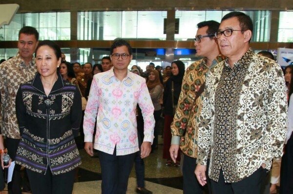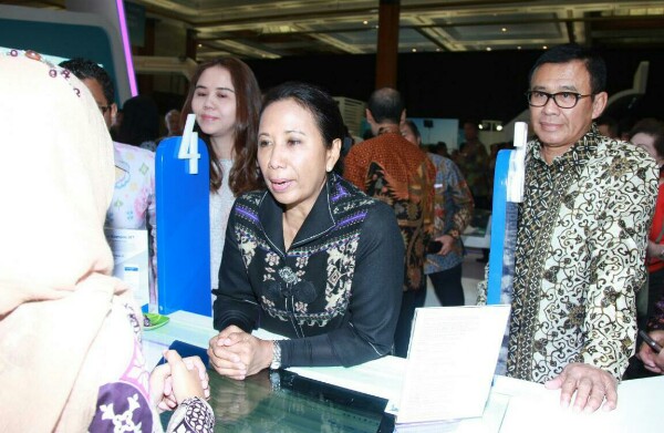 Direktur utama BNI, Achmad Baiquni (kiri) bersama Menteri Badan Usaha Milik Negara (BUMN), Rini Soemarno (kedua kanan) dan Direktur Utama Garuda Indonesia (kanan) membuka Pameran wisata Garuda Indonesia Travel Fair (GATF) 2017 Fase II di JCC, Jakarta, Jumat, 22 September 2017.