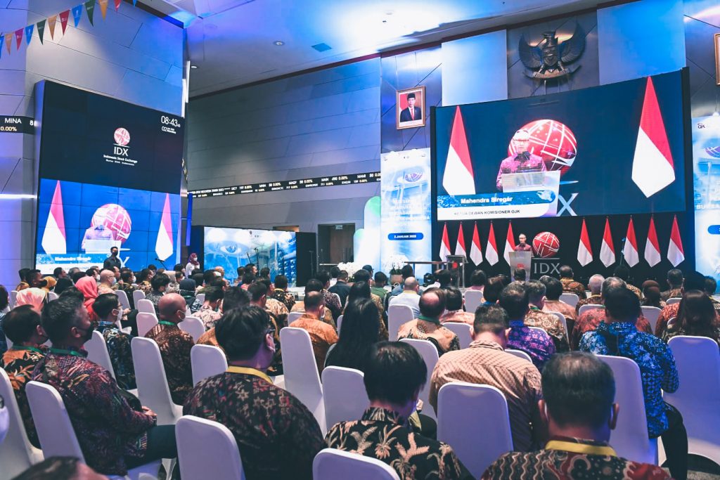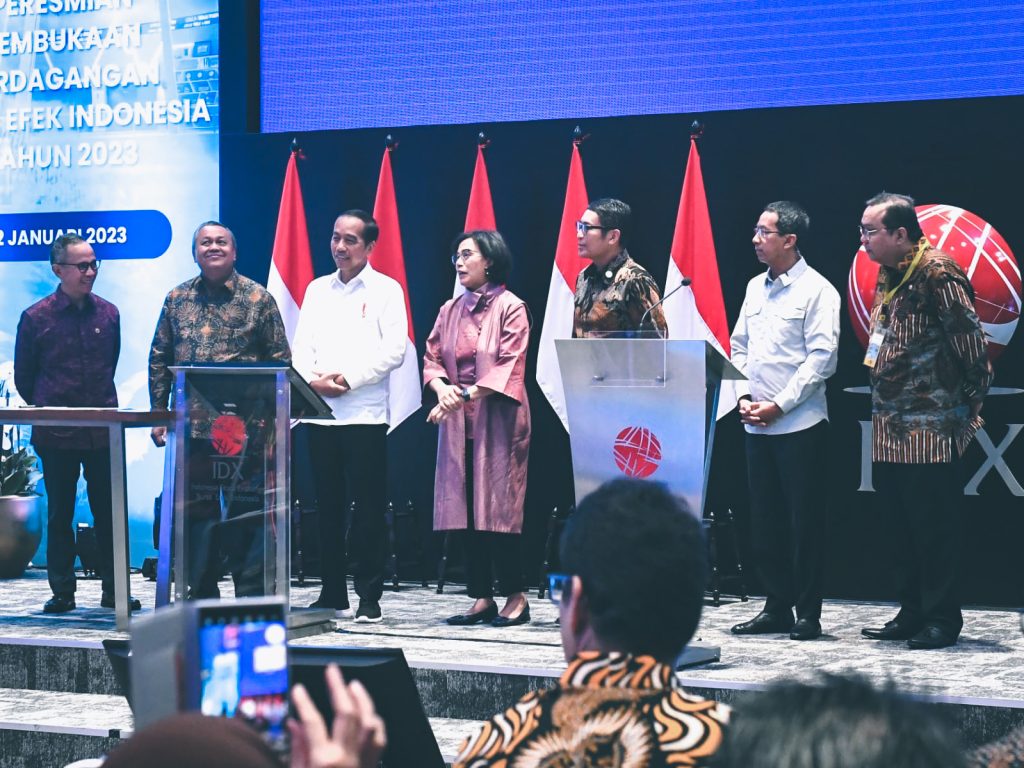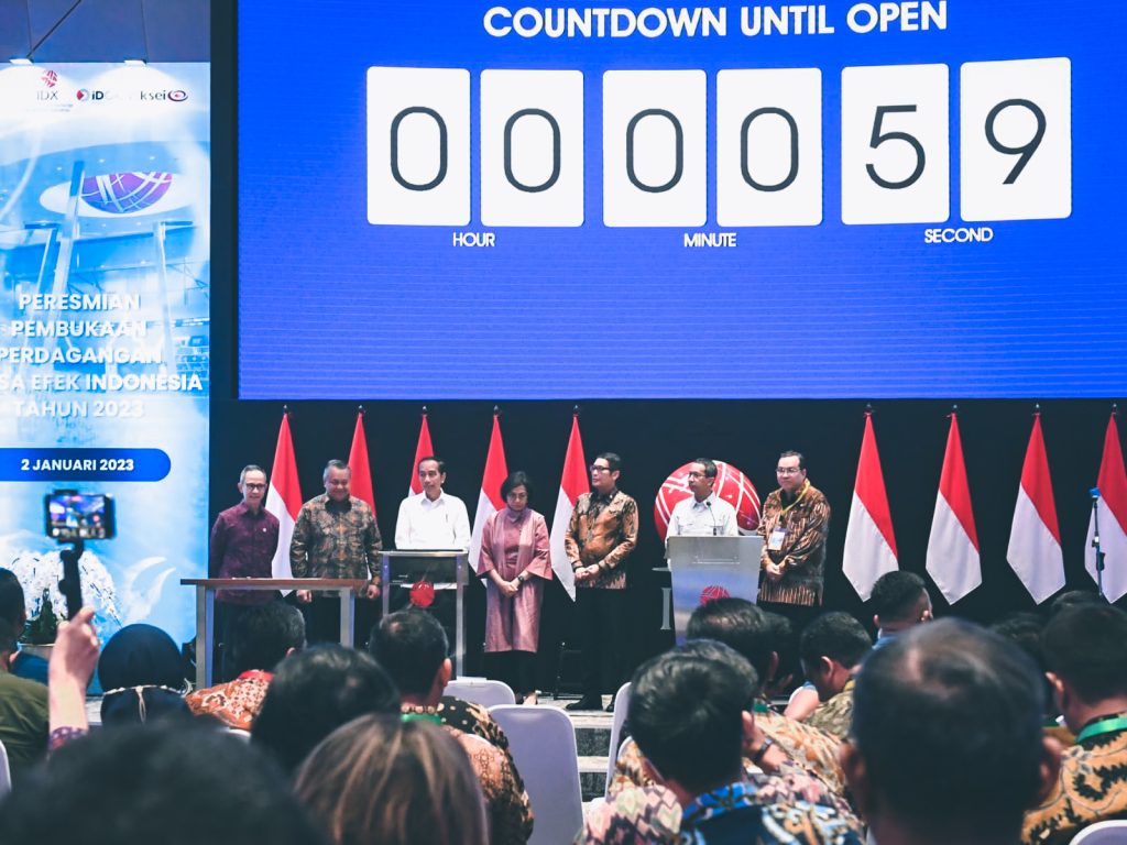 Dalam sambutannya, Jokowi mengaku senang mengetahui bahwa investor pasar modal didominasi anak muda. Ia meyakini industri pasar modal Indonesia sangat menjanjikan. Pada pembukaan perdagangan saham di awal tahun 2023, Indeks Harga Saham Gabungan (IHSG) dibuka melemah 8,51 poin atau 0,12 persen ke 6.842,. Foto : Biro Pers, Media, dan Informasi Setpres.