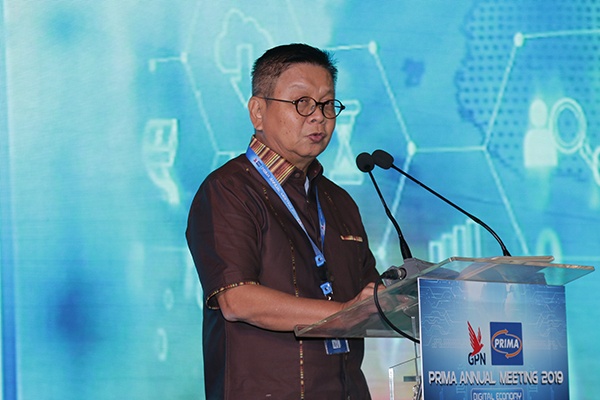 Presiden Direktur PT Rintis Sejahtera, penyelenggara switching Jaringan PRIMA, Iwan Setiawan tengah memberikan sambutan saat membuka Prima Annual Meeting 2019, di The Mulia, Nusa Dua, Bali, Kamis, 10 Oktober 2019. Event yang digelar pada 9 – 11 Oktober 2019 ini dihadiri 80 bank dan 14 billers mitra Jaringan PRIMA.