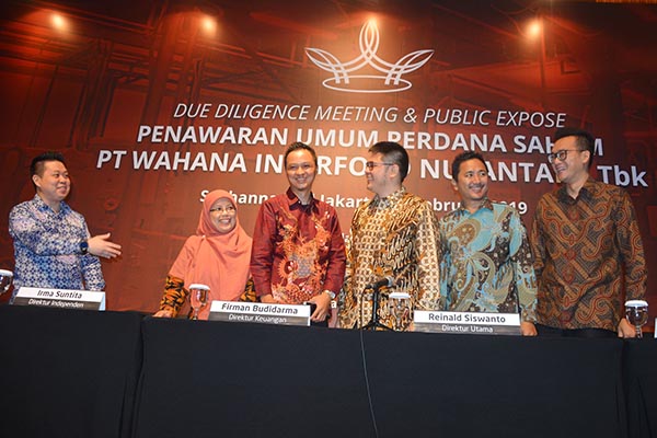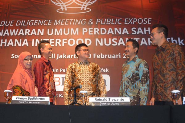 Direktur Utama PT Wahana Interfood Nusantara Tbk Reinald Siswanto (tengah) bersama Direktur Independen Irma Suntita, Direktur Firman Budidarma, Komisaris Utama Donny Hartanto, dan Komisaris Independen Tonny Sutanto Mahadarta (kiri ke kanan) berbincang usai penawaran umum perdana saham perseroan, di Jakarta, Rabu 20 Februari 2019. Produsen kakao dan cokelat itu melakukan penawaran umum perdana dengan melepas sebanyak 33,07% saham, atau sebesar 168 juta saham dengan nilai nominal Rp100 per saham.