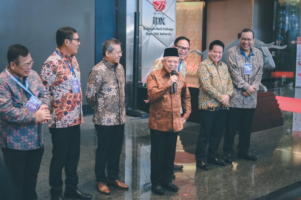 Wakil Presiden (Wapres) K.H. Ma’ruf Amin tengah memberikan keterangan pada media usai acara peresmian Pencatatan Perdana Efek Beragun Aset Syariah Berbentuk Partisipasi Sarana Multigriya Finansial-Bank Syariah Indonesia di Bursa Main Hall Bursa Efek Indonesia (BEI), Jakarta.