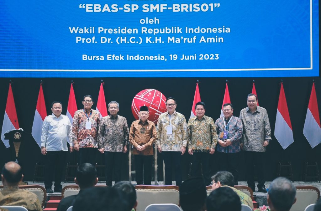 Wakil Presiden RI KH Ma’ruf Amin (keempat dari kanan) bersama Sekretaris Jenderal Masyarakat Ekonomi Syariah Iggi Haruman Achsien, Ketua Eksekutif Pengawas Pasar Modal Keuangan Derivatif dan Bursa Karbon OJK Inarno Djajadi, Wakil Menteri Keuangan RI Suahasil Nazara, Wakil Menteri BUMN Kartika Wirjoatmodjo, Direktur Utama PT Bank Syariah Indonesia Tbk Hery Gunardi, Direktur Utama PT Sarana Multigriya Finansial (persero) Ananta Wiyogo dan Direktur Utama PT Bursa Efek Indonesia (BEI) Iman Rachman (kiri ke kanan) saat seremoni pencatatan perdana EBAS-SP SMF-BRIS01 di Bursa Efek Indonesia yang juga sekaligus peluncuran produk terbaru di pasar keuangan nasional, di Jakarta, Senin 19 Juni 2023.