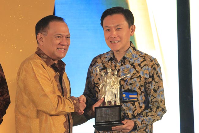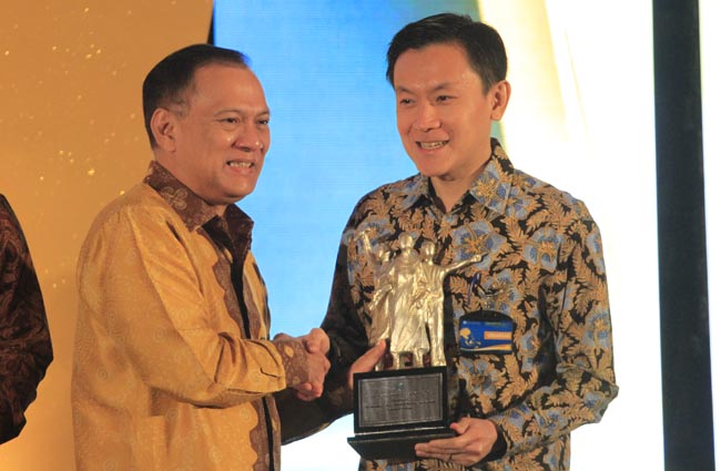Gubernur Bank Indonesia (BI) Agus D.W. Martowardojo (kiri) menyerahkan plakat penghargaan kepada Presiden Direktur PT Chandra Asri Petrochemical Tbk (CAP) Erwin Ciputra pada acara Penghargaan Bank Indonesia 2017, di Jakarta, Selasa 18 Juli 2017. CAP yang merupakan anak usaha PT Barito Pacific Tbk., meraih penghargaan Korporasi Responden Statistik Bank Indonesia Terbaik kategori Contact Liaison Terbaik, sebagai perusahaan yang proaktif dalam memberikan data statistik secara akurat dan tepat waktu, sebagai rujukan BI dalam membuat kebijakan yang mendukung stabilitas dan akselerasi pertumbuhan ekonomi nasional.(Erman Subekti)