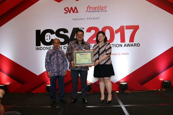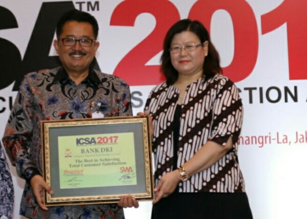 Direktur Bisnis Bank DKI, Antonius Widodo Mulyono (tengah) bersama Wakil Pemimpin Redaksi Majalah SWA, Sujatmaka (kiri) dan Direktur Riset Frontier Consulting Group, Sylvia Renate W (kanan) saat menerima penghargaan Indonesia Customer Satisfaction Award 2017 pada kategori The Best in Achieving Total Customer Satisfaction untuk produk tabungan Bank DKI di Jakarta, Rabu (22/11). Per September 2017, Bank DKI berhasil menghimpun Rp6,3 triliun Dana Pihak Ketiga dalam bentuk tabungan dengan total 1,9 juta nasabah. Dalam meningkatkan layanannya, Bank DKI juga menghadirkan aplikasi layanan keuangan JakOne Mobile untuk memudahkan nasabah dalam bertransaksi keuangan. (*)