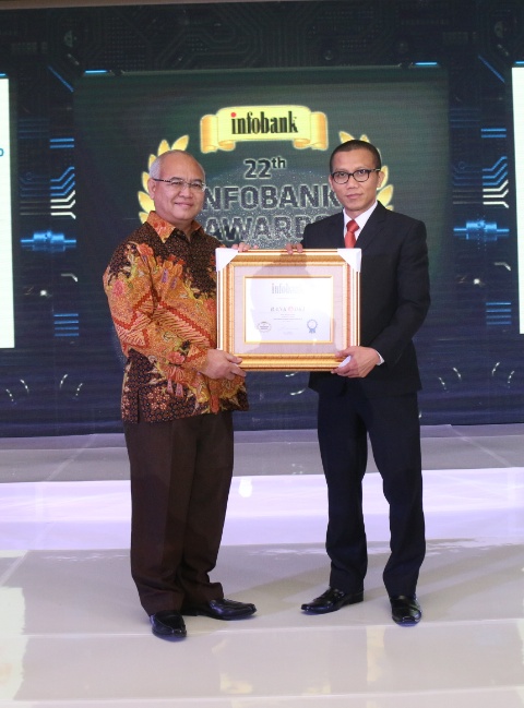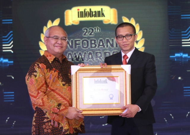 Direktur Kepatuhan Bank DKI, Budi Mulyo Utomo (kiri) menerima penghargaan kinerja keuangan sangat bagus dari wakil pemimpin redaksi Majalah Infobank, Muhammad Karnoto atas pencapaian kinerja tahun buku 2016. Per Juni 2017 di Bali,Kamis 10 Agustus 2017.Total asset Bank DKI tercatat mengalami pertumbuhan sebesar 23,3% dari 38,34 triliun per Juni 2016 menjadi sebesar Rp47,26 triliun per Juni 2017. Dana Pihak Ketiga Bank DKI yang tumbuh 28,5% dari Rp27,56 triliun per Juni 2016 menjadi Rp35,41 triliun per Juni 2017. Laba bersih Bank DKI per Juni 2017 tercatat sebesar Rp344 miliar.