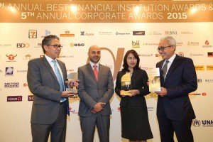 CEO Alpha South East Asia Shiddiq Bazarwalla (dua dari kiri) berbincang dengan (Ki-ka) General Manager Transactional Banking Services BNI Welan Palilingan, Vice President Treasury Bank Mandiri Diana Hadi dan Presiden Direktur Bahana TCW Investment Management Edward Lubis usai menerima penghargaan Alpha South East Asia di Jakarta, Kamis 17 September 2015. Tiga badan usaha milik negara yaitu Bank Mandiri, BNI dan Bahana mencatatkan prestasi menonjol di Indonesia dengan meraih penghargaan Best Bank, Best FX Bank dan Best IR untuk Bank Mandiri, best Trade Finance, Cash Management dan private wealth management untuk BNI serta Bahana yang meraih The Best Asset & Fund Manager.(*)