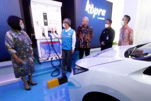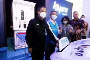 Direktur Niaga dan Manajemen Pelanggan PLN Bob Saril, Direktur Corporate Banking Bank Mandiri Susana Indah K Indriati, Direktur Hubungan Kelembagaan Bank Mandiri Rohan Hafas, Direktur Treasury & International Banking Bank Mandiri Panji Irawan dan SEVP Corporate Banking Bank Mandiri Arief Ariyana (kiri ke kanan) saat meresmikan pengoperasian Stasiun Pengisian Kendaraan Listrik Umum (SPKLU) Plaza Mandiri di Jakarta, Senin, 10 Januari 2022. Bank Mandiri mendukung pengembangan Energi Terbarukan melalui sinergi dengan PLN dan menjadi BUMN non-PLN Group pertama yang menempatkan instalasi SPKLU di kantor pusat perseroan. Fasilitas yang beroperasi 7×24 jam ini akan didukung oleh channel pembayaran online (QRIS, Livin’ by Mandiri, dll) Bank Mandiri pada aplikasi PLN Mobile untuk kemudahan transaksi.