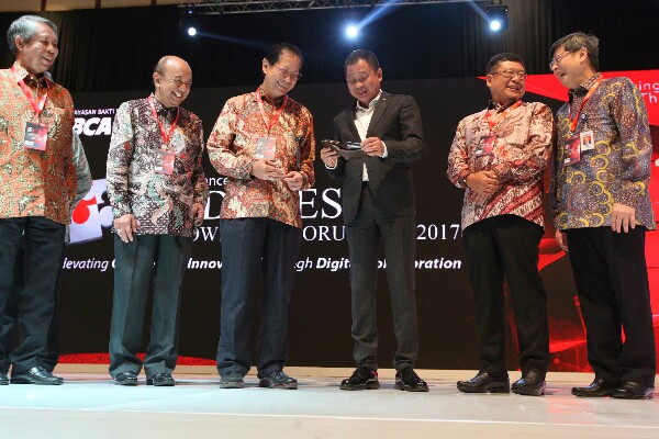 Presiden Direktur PT Bank Central Asia Tbk (BCA) Jahja Setiaatmadja (tengah), yang didampingi jajaran direksi BCA, menyerahkan plakat apresiasi kepada Menteri Energi dan Sumber Daya Mineral Republik Indonesia Ignasius Jonan (ketiga kanan) usai memberikan inspiring closing speech dalam ajang Indonesia Knowledge Forum VI di Jakarta, Rabu (04/10).