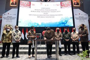 Menteri Koordinator Bidang Perekonomian Republik Indonesia (RI) Airlangga Hartarto, bersama Menteri BUMN Erick Thohir, Menteri Keuangan Sri Mulyani, Ketua Dewan Komisioner OJK Wimboh Santoso, Direktur Utama Bursa Efek Indonesia (BEI) Inarno Djajadi dan para petinggi BEI serta disaksikan oleh pelaku pasar secara virtual, secara resmi menutup perdagangan Bursa Efek Indonesia 2021 di Jakarta, Kamis, 30 Desember 2021. Sepanjang tahun 2021, pasar modal Indonesia menorehkan sejumlah pencapaian yang positif meski masih dihadapkan pada situasi Pandemi COVID-19.