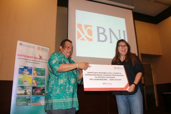 BNI memberikan bantuan CSR untuk Hutan Organik di Kawasan Megamendung, Bogor, Jawa Barat. Vice President Corporate Communication & CSR BNI Meiliana (Kanan) menyerahkan secara simbolik bantuan CSR tersebut kepada Pengelola Hutan Organik Bambang Istiawan (Kiri) di Bogor, Sabtu (5/5). Disela acara Family Gathering Bank BNI memberikan bantuan CSR secara simbolis senilai Rp430 juta untuk Nursery dan Sarana Prasarana. (*)