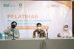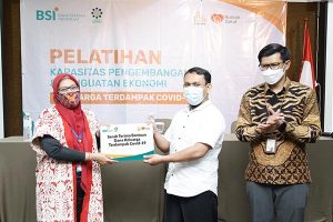 Direktur Care Program, Ilham Syahputra (tengah) dan Chief Marketing Officer Rumah Zakat, Irvan Nugraha (paling kanan) ketika melakukan serah terima bantuan dana keluarga terdampak COVID-19 (paling kiri) kepada perwakilan keluarga terdampak COVID-19, Senin 17 Januari 2022. Penyerahan bantuan ini dilakukan dalam rangkaian pelatihan pengembangan diri & penguatan ekonomi terdampak COVID-19 untuk 20 kepala keluarga. Pelatihan ini juga bertujuan meningkatkan kualitas SDM penerima manfaat dalam aspek pengembangan usaha. Diharapkan setelah menyelesaikan pelatihan ini penerima manfaat dapat mempertahankan produktifitasnya secara stabil, meningkatkan wawasan, pengetahuan, dan keterampilan dalam mengelola usaha mikro, serta memecahkan permasalahan di bidang kewirausahaan dengan cepat dan tepat.