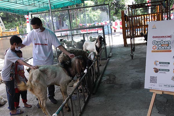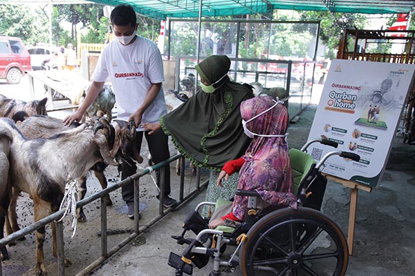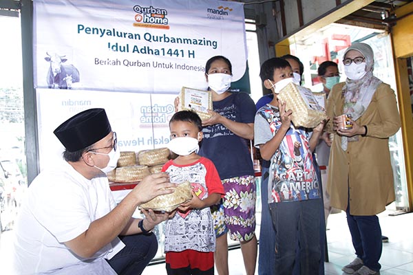 Corporate Secretary Mandiri Syariah Ahmad Reza menyerahkan daging kurban kepada penyandang disabilitas di Jakarta, Sabtu 1 Agustus 2020. Mandiri Syariah bersama nasabah menyalurkan lebih dari 2.500 hewan kurban ke pesantren, komunitas disabilitas, masjid, lembaga dan yayasan, lingkungan masyarakat, dan mitra lainnya di seluruh pelosok negeri. Jumlah tersebut termasuk dari nasabah perkurban (mudhohi) yang mempercayakan dan membeli hewan kurban melalui mitra supplier lewat transaksi digital di Mandiri Syariah Mobile.