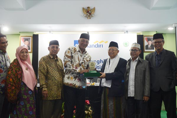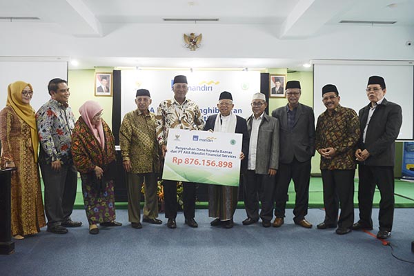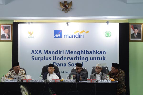 Director of Sales AXA Mandiri Henky Oktavianus (tengah) menyerahkan mockup dana kepada Baznas dari PTAXA Mandiri Financial Services kepada Ketua Umum MUI Prof. Dr. KH Maruf Amin (ketiga kanan) yang dilakukan di Jakarta, Selasa, 24 September 2019. PT AXA Mandiri Financial Services (AXA Mandiri) unit Syariah kembali mewujudkan komitmennya dalam menjalankan amanah para pemegang polis asuransi syariah dengan menyerahkan sebagian surplus underwriting kepada Islamic Dakwah Fund (MUI) melalui Badan Amil Zakat Nasional (BAZNAS) yang akan dimanfaatkan sebagai dana sosial. Penyerahan juga disaksikan oleh Chief of Sharia AXA Mandiri Srikandi Utami, Perwakilan BAZNAS Prof. Dr. KH. Ahmad Satori Ismail, beserta SEVP Syariah Mandiri Anton Sukarna Dewan Pengawas Syariah AXA Mandiri unit Syariah, Pimpinan dan Anggota MUI.