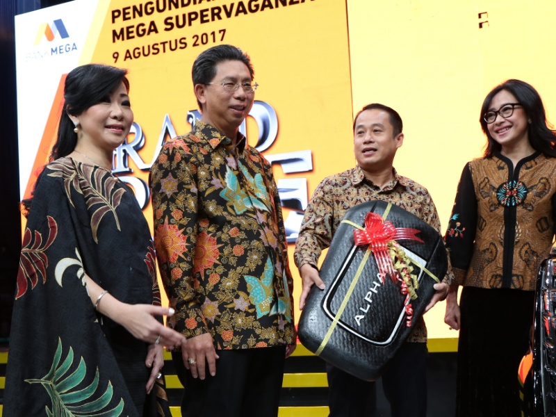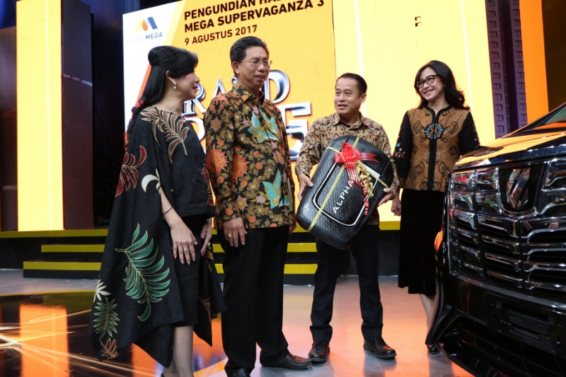 Direktur Utama Bank Mega, Kostaman Thayib (kedua kiri), didampingi oleh Direktur Funding & Network Bank Mega, Diza Larentie (kiri) dan Regional Head Bandung, Rika Rahayu Begawan (kanan), menyerahkan hadiah grand prize berupa 1 unit Toyota Alphard dari Program Mega Super Vaganza 3 kepada Heri Sastoyo nasabah Bank Mega Cabang Bandung – Kopo (kedua kanan),di Jakarta,Rabu 9 Agustus 2017.Sejak diluncurkannya pada 16 Januari 2016 hingga akhir Juni 2017, Bank Mega mengakuisisi 123ribu NOA baru atau meningkat 49% dengan total tabungan baru sebesar Rp. 2,6 triliun atau meningkat 75% dibandingkan sebelum program diluncurkan.