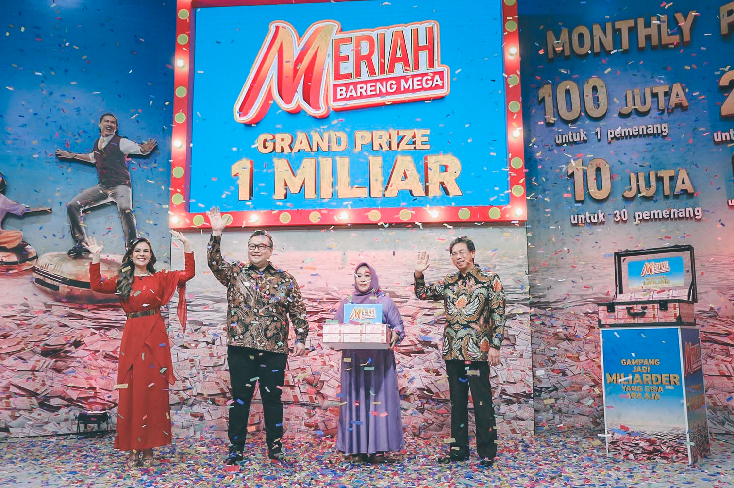 Direktur Utama Bank Mega Kostaman Thayib (kanan) disaksikan Retail Product Management Head Bank Mega Hersen (kiri) menunjukan hadiah grand prize kepada nasabah yang beruntung, di Jakarta.Direktur Utama PT Bank Mega Tbk. (MEGA) Kostaman Thayib (kiri) didampingi Retail Product Manajemen Head Hersen (kanan) menyerahkan hadiah Grand Prize Program Meriah Bareng Mega berupa uang tunai senilai Rp1 miliar kepada nasabah beruntung Maslia (tengah) yang berasal dari Bank Mega KCP Bontang, penyerahan dilakukan di Jakarta.