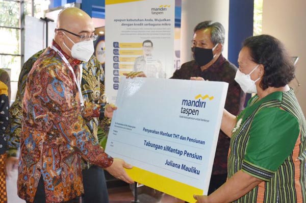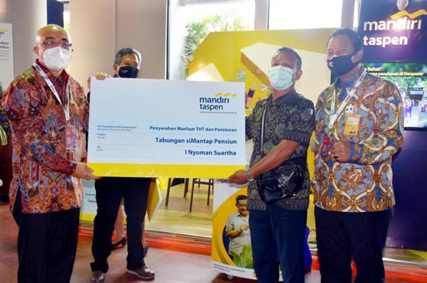 Kepala Badan Kepegawaian Negara (BKN) Bima Haria Wibisana (kiri) secara simbolis penyerahan manfaat Tabungan Hari Tua (THT) dan pensiunan kepada pensiunan PNS I Nyoman Suartha (tengah) yang didampingi Direktur Bank Mandiri Taspen Iwan Soeroto (kanan) pada acara Rapat Koordinasi Nasional BKN di Hotel Westin Nusa Dua, Kamis, 1 Juli 2021. Penyerahan manfaat tersebut merupakan implementasi UU ASN No 5 Tahun 2014 dan PP No 49 Tahun 2018.