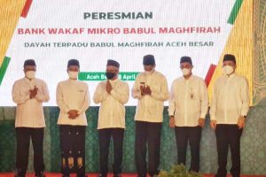 SEVP Operation BSI Wahyu Avianto, Pimpinan Dayah Babul Maghfirah Ustad Masrul Aidi, Ketua Dewan Komisioner OJK Wimboh Santoso, Staf Ahli Bidang Keistimewaan Aceh SDM dan Hub Kerjasama Iskandar Syukri, Kepala OJK Aceh Yusril dan Chief Corporate Affairs Astra Riza Deliansyah (kiri ke kanan) tengah menabuh rebana saat peresmian Bank Wakaf Mikro Astra bersama Asuransi Astra di Banda Aceh, Jumat, 8 April 2022. Sebagai wujud dukungan terhadap peningkatan inklusi keuangan masyarakat, Astra meresmikan Bank Wakaf Mikro yang merupakan Badan Wakaf Mikro yang ke-9 dari 10 BWM yang telah didirikan Astra bersama unit bisnis Astra Financial dimana merupakan BWM ke 3 dari Asuransi Astra.