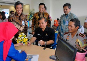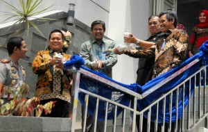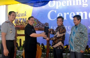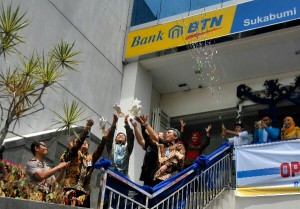 Direktur Bank BTN Nixon LP Napitupulu bersama Asisten Administrasi Wali Kota Sukabumi Kostaman (kedua kanan), Kepala Kanwil I Bank BTN Satya Wijayantara (kanan) dan Kepala Cabang Bank BTN Sukabumi Wahyu Ilin (kiri) berbincang usai meresmikan Kantor Cabang Sukabumi, Jawa Barat, Kamis (23/11). PT Bank Tabungan Negara (Persero) Tbk meresmikan kantor cabang Bank BTN Sukabumi sebagai strategi korporasi dalam menyambut pembangunan tol yang menghubungkan Sukabumi-Ciawi-Bogor. Tol yang disiapkan pemerintah untuk menghubungkan daerah dengan pusat ekonomi ini akan meningkatkan bisnis di wilayah Sukabumi. Bank BTN Sukabumi yang sebelumnya bersetatus sebagai kantor cabang pembantu ini ditingkatkan statusnya menjadi kantor cabang penuh untuk dapat memberikan pelayanan perbankan lebih baik dan cepat kepada masyarakat di wilayah Sukabumi khususnya dalam pemenuhan kebutuhan rumah untuk mendukung Pogram Sejuta Rumah. (*)