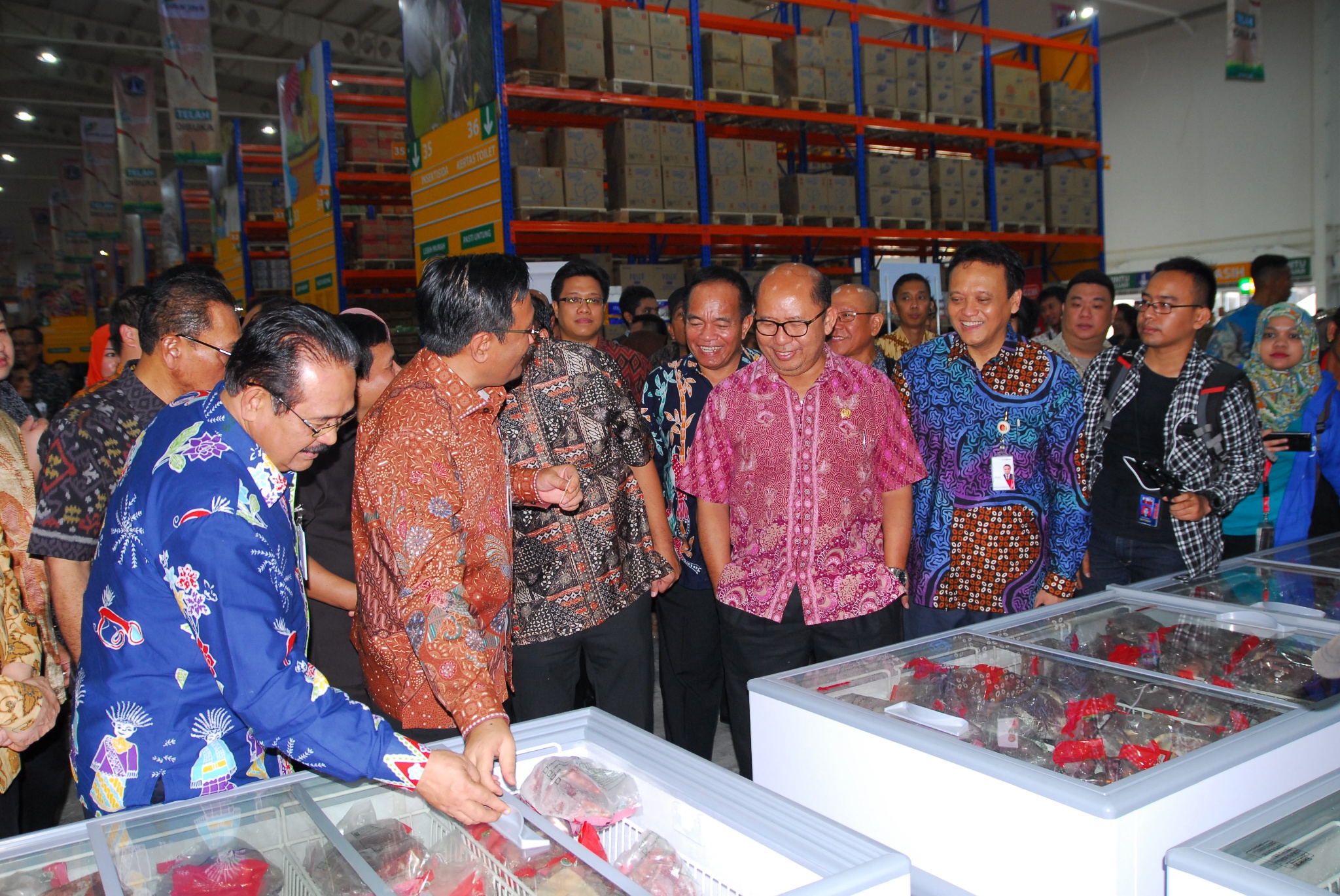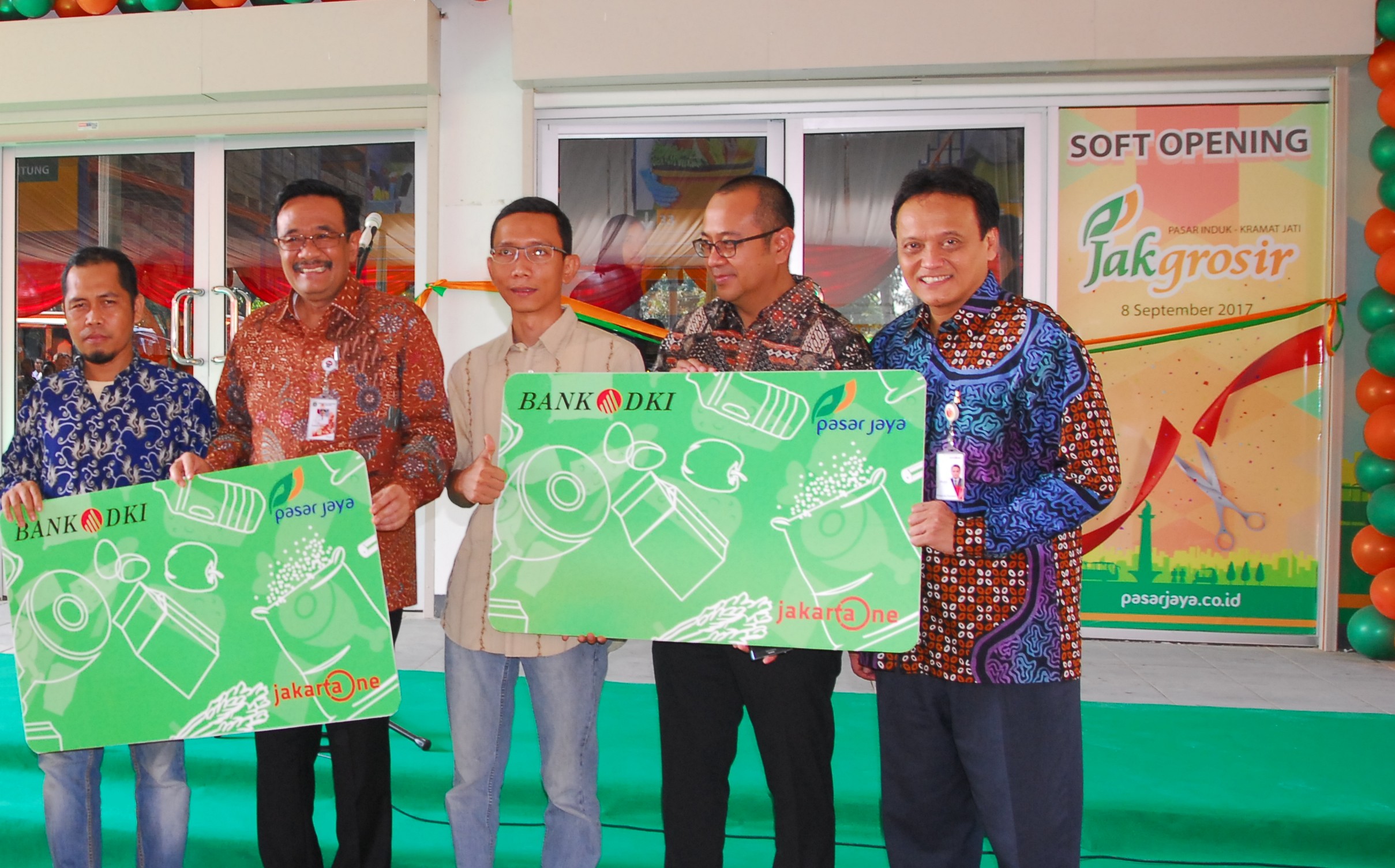 Direktur Teknologi & Operasional Bank DKI, Priagung Suprapto (paling kanan) bersama Gubernur Provinsi DKI Jakarta, Djarot Saiful Hidayat (kedua dari kiri) dan Direktur Utama PD Pasar Jaya, Arief Nasrudin (kedua dari kanan) memberikan simbolis kartu Monas Bisnis Perkulakan  kepada pedagang UMKM usai peresmian Jakgrosir di Pasar Induk Kramat Jati, Jakarta (08/09).